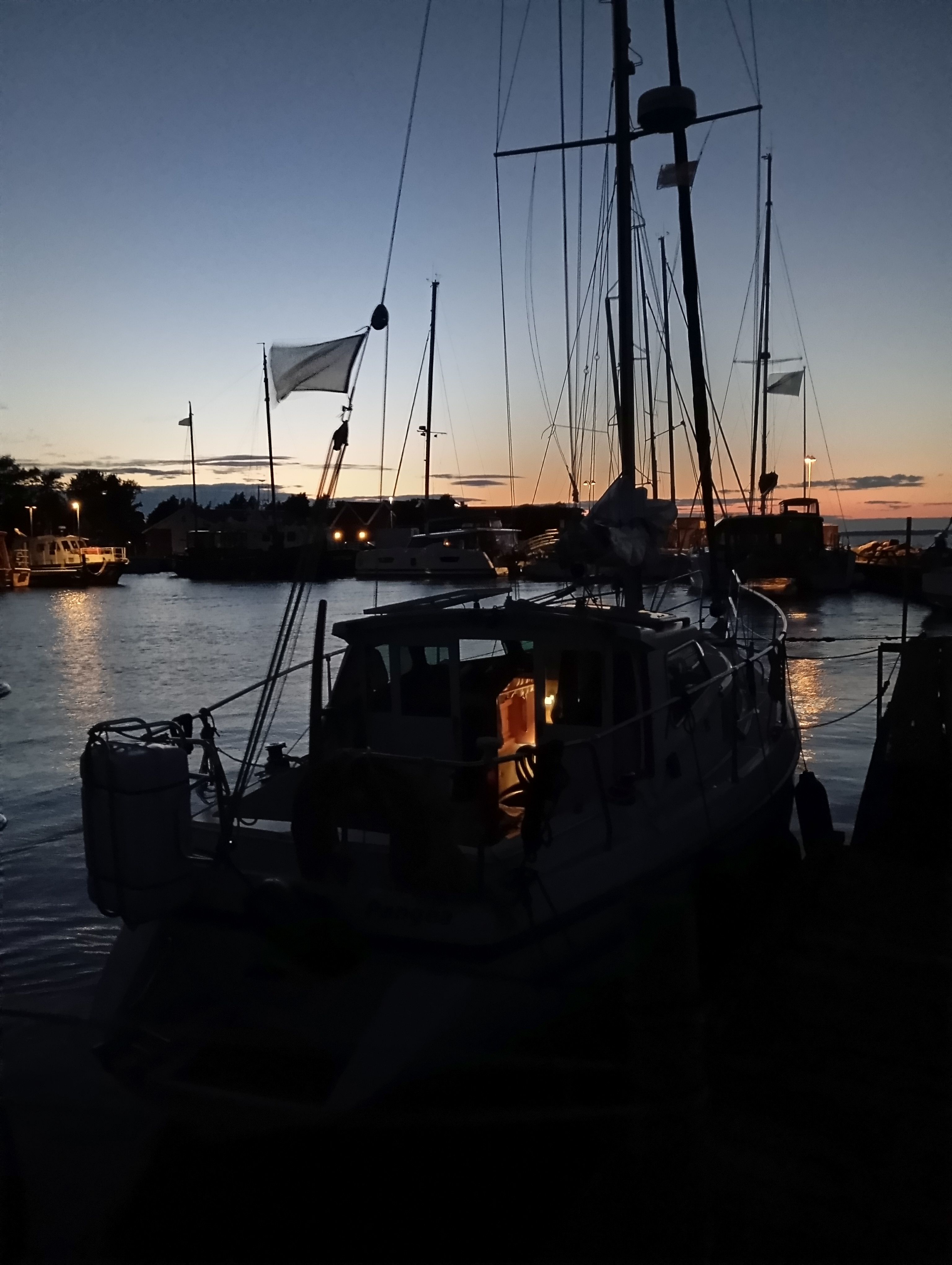 Eine kleine Wetterstörung sollte uns auch im Sund erreichen. Mit reichlich Luftfeuchtigkeit und mäßiger Sicht durchfuhren wir den Sund und kamen vor die Brücke in Nyköbing, als selbige fünf Minuten später öffnete! Läuft! Nach der Brückendurchfahrt baute sich im Südwesten eine mächtige Front auf, die ich lieber am Steg verbringen wollte. Also beim Nyköbing Segelclub links ran gefahren und außen an den Wellenschutz provisorisch fest und Mittag gemacht. Auch nach dem Mittagessen wollte sich das Wetter nicht beruhigen, sodass wir entschieden haben, hier zu bleiben. Dazu verholten wir uns an den Kopf der Brücke, um genügend tiefes Wasser zu haben.