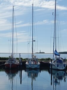 Die Windvorhersage versprach plötzlich einen Ostwind, den wir auf dem Kurs Richtung Guldborgsund nicht brauchen konnten. Also Leinen los und Kurs Südost. Als wir gegenüber, die südwestliche Ecke Fünens gerundet hatten, drehte der Wind bereits auf Ost, mit südöstlichen Einschlägen…also weiter unter zweifach gereffter Genua und Maschine. Wir konnten gerade so den Kurs nach Femö halten. Die Abdrift tat das ihrige, sodass wir nach einer gefühlt zu langen Zeit fast gegen an die Insel Vejrö vor dem Bug hatten. Da meiner Frau mittlerweile die Seekrankheit zu schaffen machte, drehte ich langsam zur Insel und in den Hafen. Es überrascht schon ein wenig, wenn der Hafen in der Hochsaison nur zur Hälfte belegt ist. Der Grund hierfür könnten die Liegeplatzgebühren sein: 500 Kronen, also rund 67 Euro. Das ist für nordeuropäische Verhältnisse ein wahrer Schlag ins Kontor. Egal, die Stimmung ging nach dem Anlegen in die Höhe und die (eingekauften) Serviceangebote, die kostenfreien und wirklich guten Fahrräder sowie Sanitäranlagen wie in einem Hotel wiegen das (fast) wieder auf! Dazu einen Strand direkt vor dem Hafenbecken toppen das Angebot nochmals.